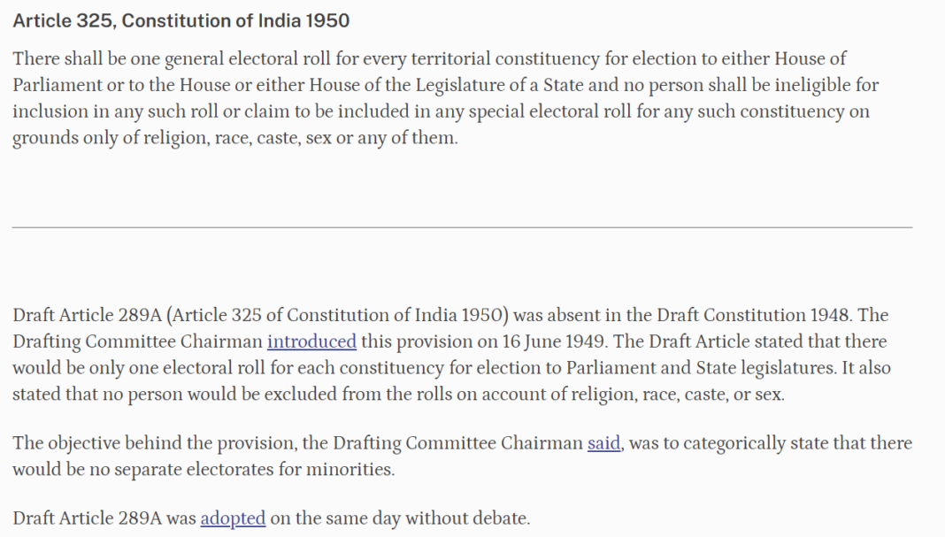 भारतीय संविधान के अनुच्छेद 325 में स्पष्ट रूप से कहा गया है कि संसद के किसी भी सदन या राज्य के विधानमंडल के किसी भी सदन के चुनाव के लिए प्रत्येक निर्वाचन क्षेत्र में एक सामान्य मतदाता सूची होगी। कोई भी व्यक्ति केवल धर्म, जाति, नस्ल या लिंग के आधार पर किसी विशेष मतदाता सूची में शामिल होने का दावा नहीं कर सकता।