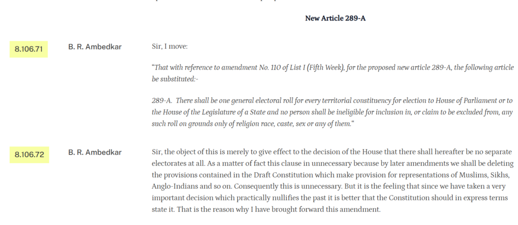 संविधान के सूत्रधार अंबेडकर ने अनुच्छेद 289ए पर चर्चा के दौरान कहा, “इसका उद्देश्य केवल सदन के उस निर्णय को लागू करना है कि अब से कोई अलग निर्वाचक मंडल नहीं होगा।” उन्होंने यह भी कहा कि यह खंड वैसे तो अनावश्यक है, क्योंकि बाद के संशोधनों से मुसलमानों, सिखों, एंग्लो-इंडियन आदि के पृथक प्रतिनिधित्व वाले प्रावधान हटा दिए जाएँगे।