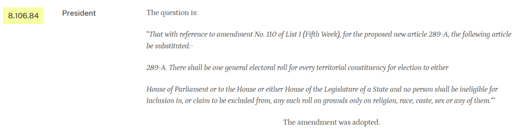 1948 के संविधान के मसौदे में यह प्रावधान नहीं था — इसे बाद में अनुच्छेद 325 के रूप में अधिनियमित किया गया। 16 जून 1949 को मसौदा समिति के अध्यक्ष ने यह प्रावधान पेश किया। इसमें निर्दिष्ट किया गया कि राज्य विधानसभाओं और संसद के चुनावों के लिए प्रत्येक निर्वाचन क्षेत्र में एक ही मतदाता सूची होगी।
